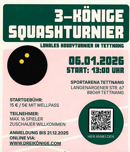 Am 06. Januar 2026 findet das traditionelle 3-Königs-Squashturnier von Max Zwisler in der Tettnanger Sportarena statt. Das Hobbyturnier ist auf 16 Teilnehmer begrenzt – also schnell sein!