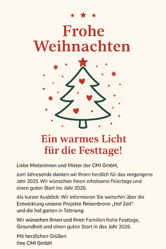 zum Jahresende möchten wir uns ganz herzlich bei Ihnen für das entgegengebrachte Vertrauen im Jahr 2025 bedanken. Wir wünschen Ihnen eine frohe und erholsame Weihnachtszeit, Gesundheit und einen guten Rutsch in das Jahr 2026.